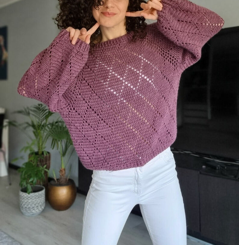 This top-down sweater flows seamlessly from neckline to hem, creating a soft drape with a deep yoke and wide sleeves for an effortless, oversized look. Worked in one piece with no seams, it’s a soothing project that feels as good to make as it does to wear 🌸🧶