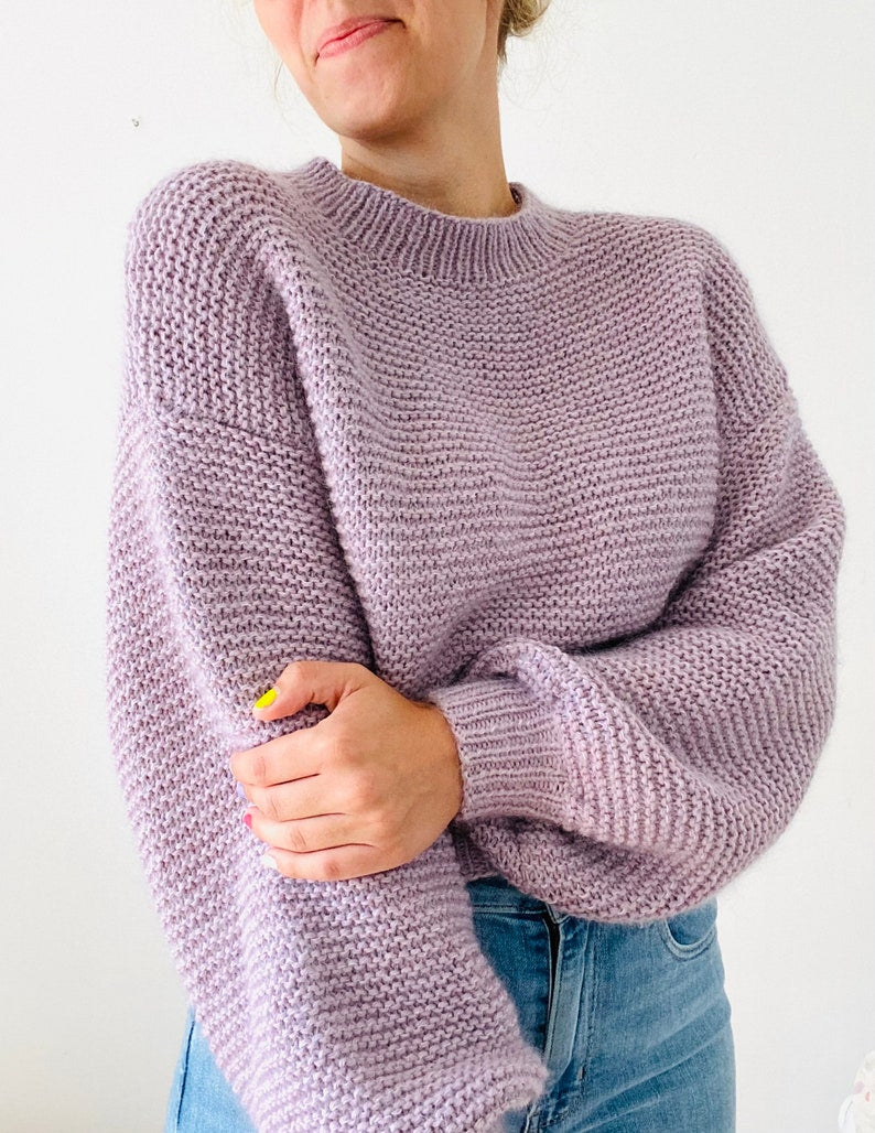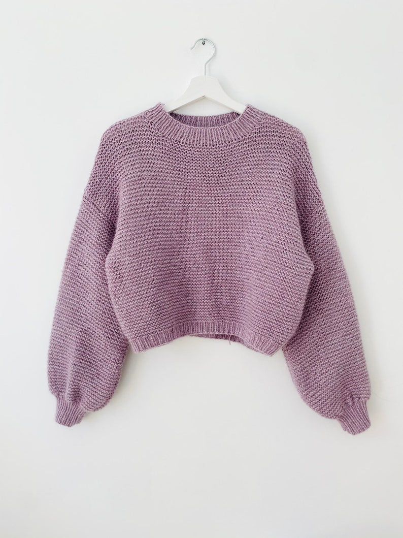 Beginner-friendly and effortlessly stylish, this oversized, cropped sweater in squishy garter stitch features a round neck and wide sleeves that taper gently at the cuffs. Perfect over high-waisted jeans or skirts, it’s light, fluffy, and easy to make. Knit in four simple pieces, then sewn together with a neat neckline rib – add a strand of mohair for that extra soft haze ☁️🧥